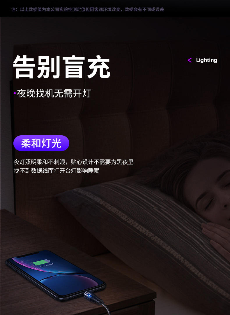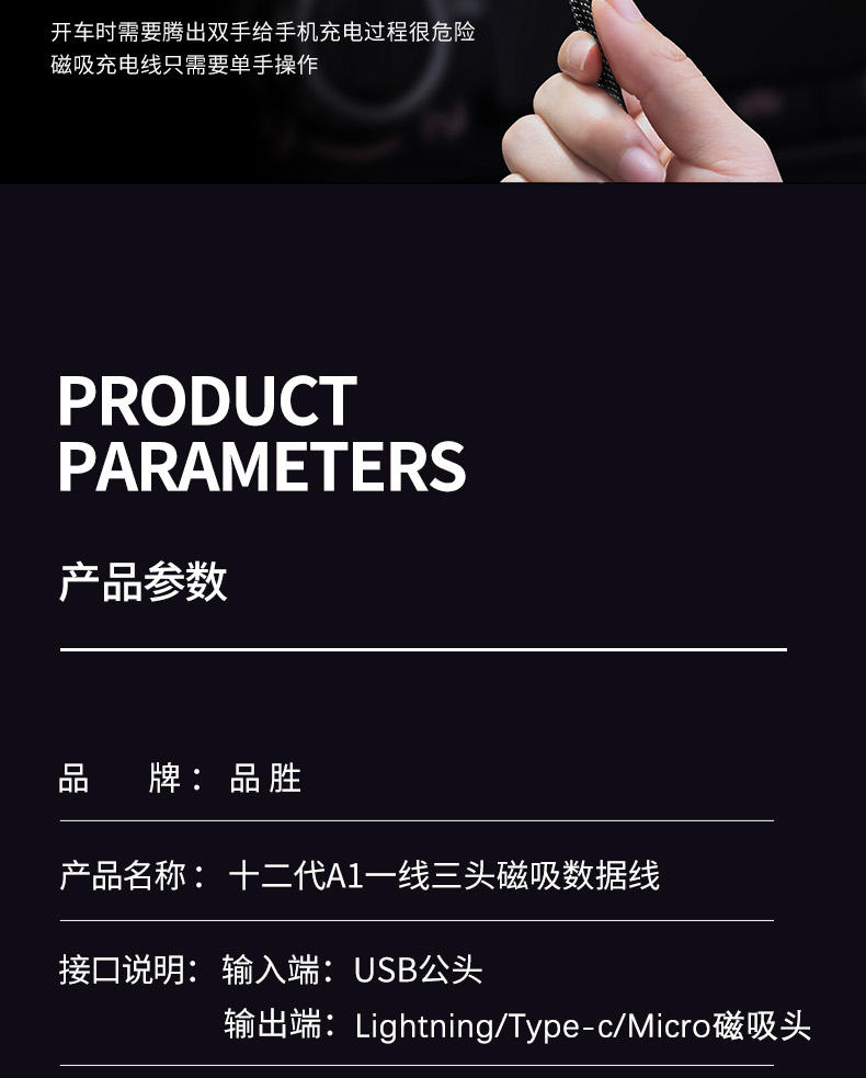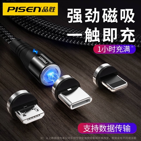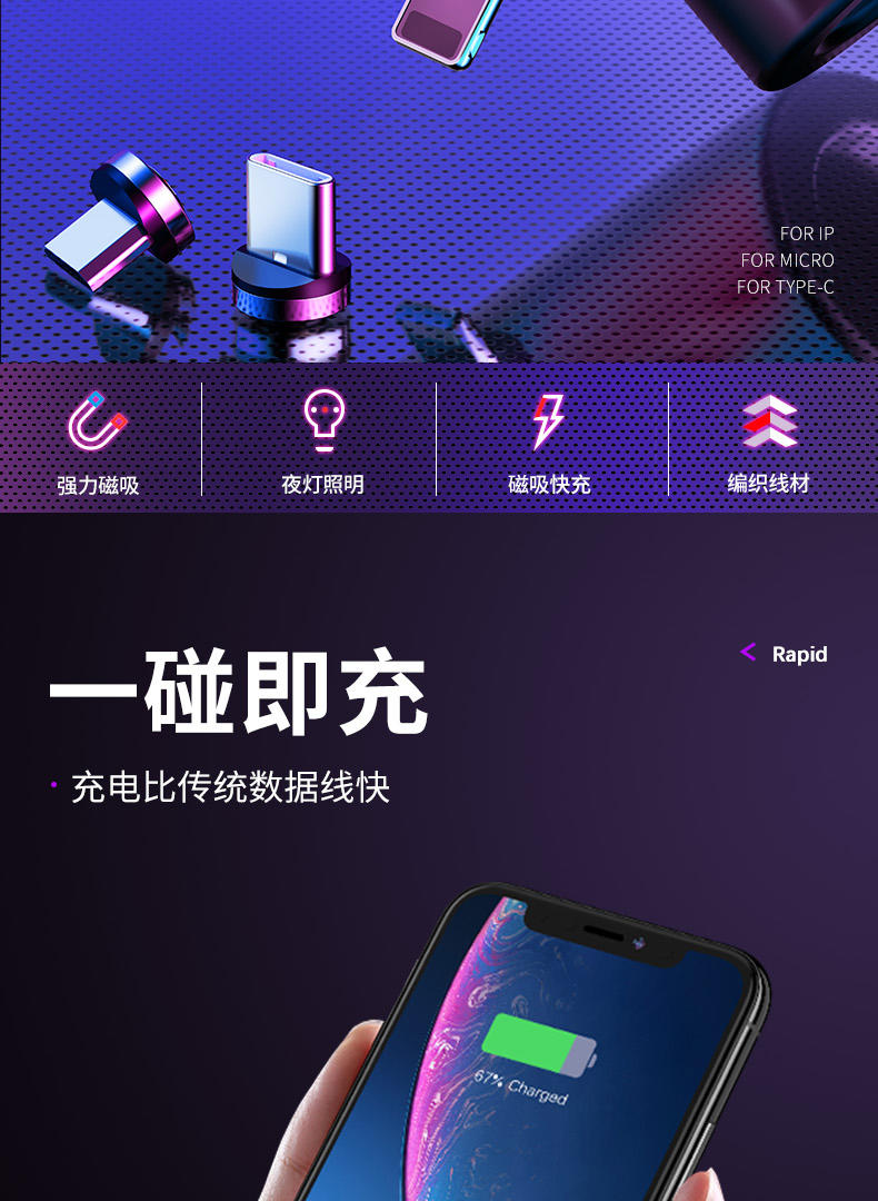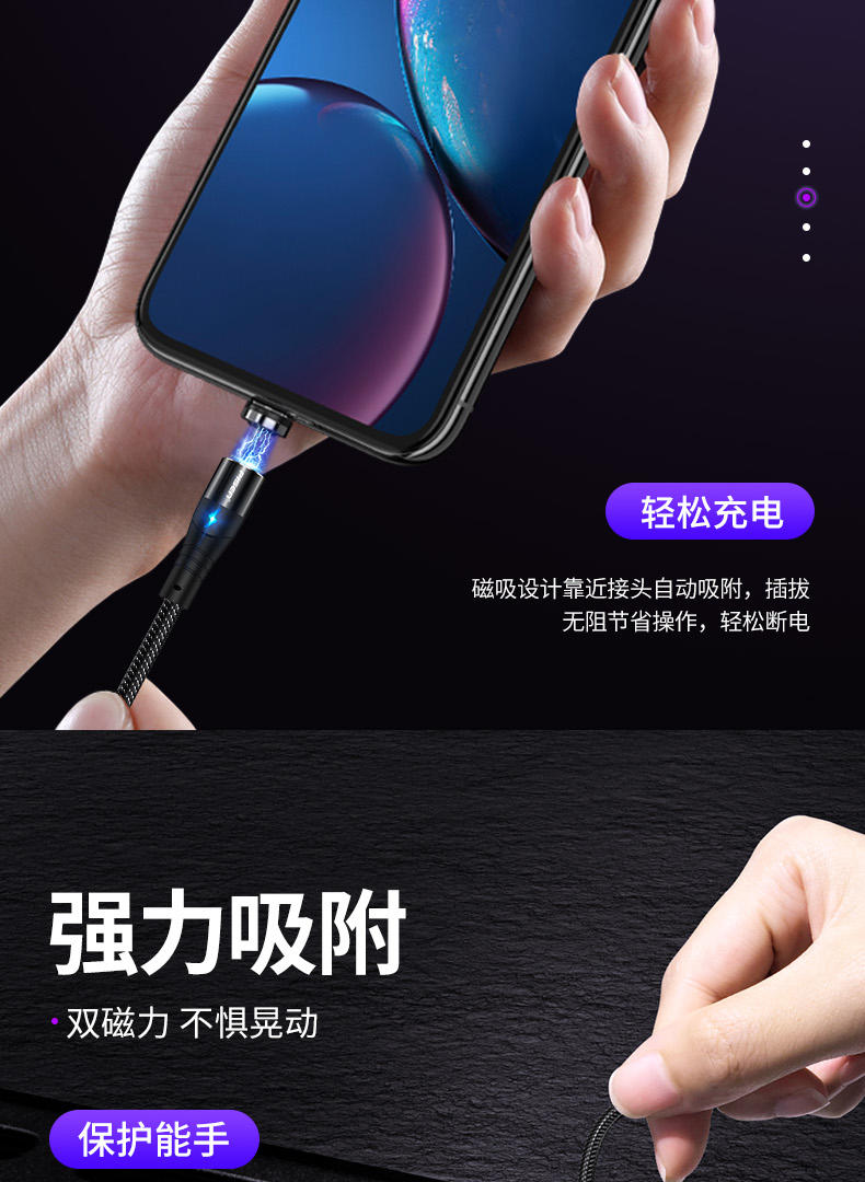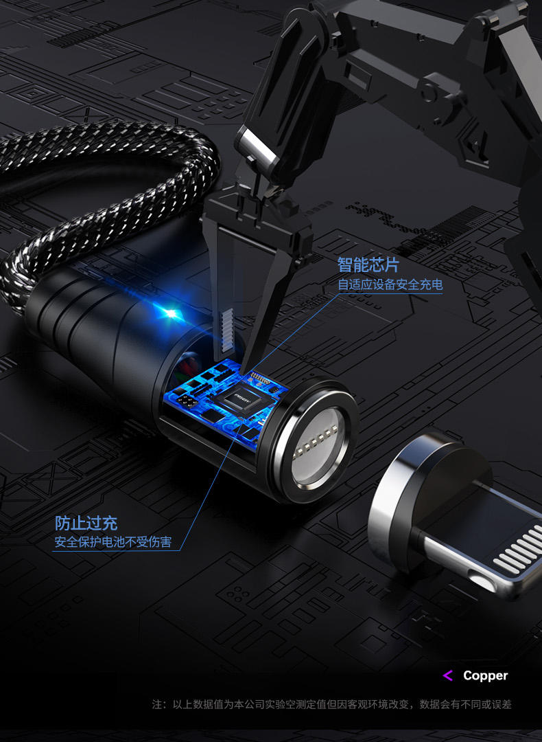三合一闪电灯免插拔圆头磁吸数据充电线(2m)(魔幻黑)纸质彩盒装-国内版CN